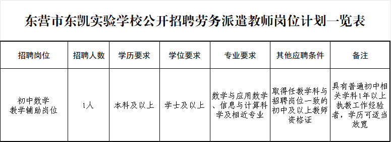 因工作需要,东营市东凯实验学校委托东营市东凯人力资源服务有限公司面向社会公开招聘劳务派遣教师,现将有关事项公告如下: